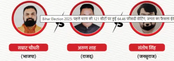 Bihar Election 2025: बिहार विधानसभा चुनाव के पहले चरण में 18 जिलों की 121 सीटों पर शाम छह बजे तक करीब 64.46 फीसदी मतदान दर्ज किया गया है। इन 121 सीटों पर कई प्रमुख चेहरे चुनावी दौड़ में शामिल हैं।