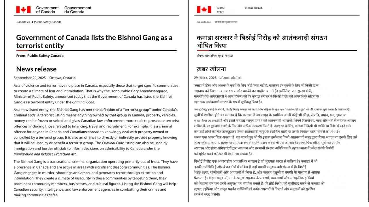 Canada News: सोमवार को कनाडा ने लॉरेंस बिश्नोई गिरोह को आधिकारिक रूप से आतंकी संगठन करार दिया। सरकार ने कहा कि यह गिरोह हत्या करता है, गोली चलाता है, आग लगाता है। यह जबरन पैसे वसूलता है और धमकियों से डर फैलाता है।