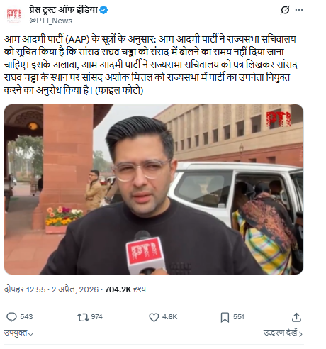 Delhi News: आम आदमी पार्टी ने राज्यसभा सचिवालय को एक पत्र भेजकर अपने डिप्टी लीडर राघव चड्ढा को उनके पद से हटाने की मांग की है।