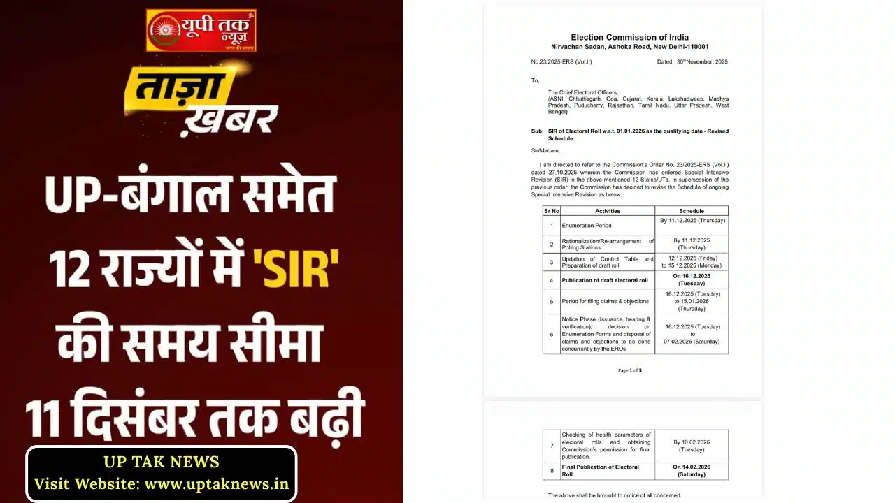 EC SIR Deadline Extension: चुनाव आयोग ने 12 राज्यों में एसआईआर की डेडलाइन सात दिन बढ़ा दी है। अब मतदाता सूची के विशेष गहन पुनरीक्षण (SIR) की प्रक्रिया 11 दिसंबर तक चलेगी। पुनरीक्षण की समयसीमा बढ़ाने का एलान करते हुए आयोग ने जो नोटिस जारी किया है, इसके मुताबिक पुनरीक्षण के बाद मतदाता सूची के मसौदे का प्रकाशन 16 दिसंबर को होगा। अंतिम मतदाता सूची 14 फरवरी को प्रकाशित की जाएगी। चुनाव आयोग ने कहा है कि मतदाताओं के नाम दर्ज करने के लिए फॉर्म भरे जाने यानी इन्युमरेशन (Enumeration) की अवधि 11 दिसंबर तक बढ़ाई गई है।