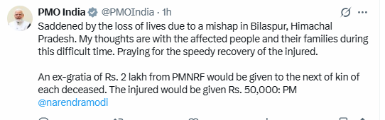प्रधानमंत्री मोदी ने सोशल मीडिया पर पोस्ट कर कहा, “हिमाचल प्रदेश के बिलासपुर में हुए हादसे से दुखी हूं। जिन लोगों ने अपने प्रियजनों को खोया है, उनके प्रति संवेदना व्यक्त करता हूं। ईश्वर घायलों को जल्द स्वस्थ करें।