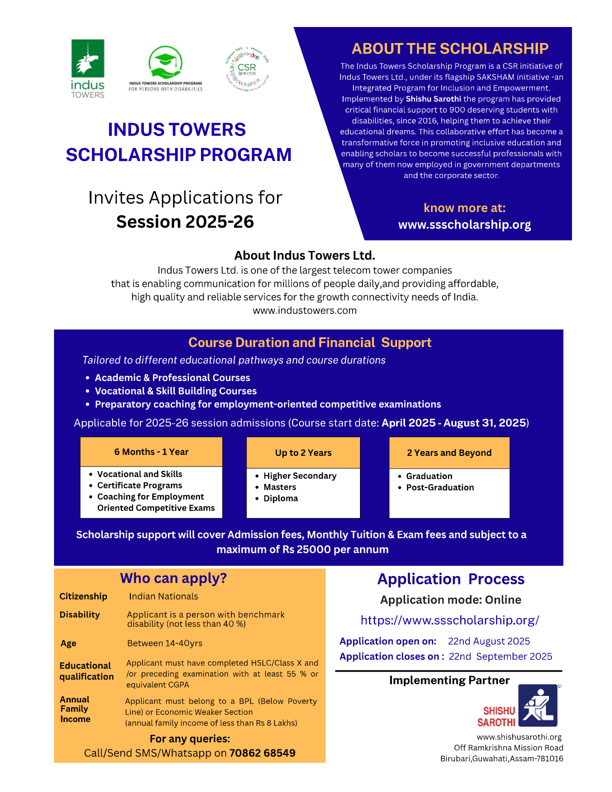 Indus Towers Scholarship Yojna 2025: दुनिया की सबसे बड़ी दूरसंचार अवसंरचना कंपनियों में से एक, इंडस टावर्स लिमिटेड, अधिकार-आधारित, गैर-लाभकारी संगठन, शिशु सरोथी (बहु विकलांगता पुनर्वास और प्रशिक्षण केंद्र) के साथ साझेदारी में, यह घोषणा करते हुए प्रसन्न है कि 2025-26 शैक्षणिक सत्र के लिए ‘ इंडस टावर्स छात्रवृत्ति कार्यक्रम ‘ अब भारत भर के विकलांग छात्रों के आवेदन के लिए खुला है।