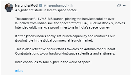 इसरो की सफल लॉन्चिंग पर खुशी जताते हुए प्रधानमंत्री मोदी ने ट्वीट किया। जिसमें पीएम मोदी ने लिखा, ‘भारत के युवाओं की ताकत से, हमारा अंतरिक्ष कार्यक्रम ज्यादा आधुनिक और असरदार बन रहा है। LVM3 ने भरोसेमंद हैवी-लिफ्ट प्रदर्शन दिखाया है, जिससे हम गगनयान जैसे भविष्य के मिशन के लिए नींव मजबूत कर रहे हैं, कमर्शियल लॉन्च सेवाओं का विस्तार कर रहे हैं और वैश्विक साझेदारी को मजबूत कर रहे हैं। यह बढ़ी हुई क्षमता और आत्मनिर्भरता को मिला बढ़ावा आने वाली पीढ़ियों के लिए बहुत बढ़िया है।’