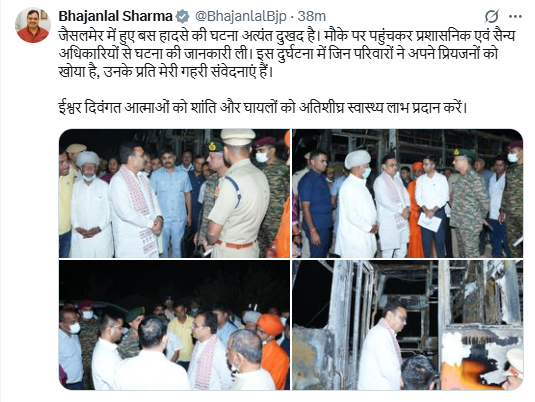 राजस्थान के मुख्यमंत्री भजनलाल शर्मा ने इस हादसे के बाद फीडबैक लिया है और जिला प्रशासन से संपर्क किया है। इस घटना को लेकर सीएम कार्यालय सक्रिय है और सीएम ने अधिकारियों को त्वरित राहत पहुंचाने के निर्देश दिए हैं। अधिकारियों ने घायलों के बेहतर इलाज के लिए अस्पतालों को अलर्ट किया है और प्रशासन को राहत कार्य में तेजी लाने के निर्देश दिए गए हैं। इसके अलावा, मुख्यमंत्री स्वयं मौके पर जाएंगे और घटनास्थल का निरीक्षण करेंगे।