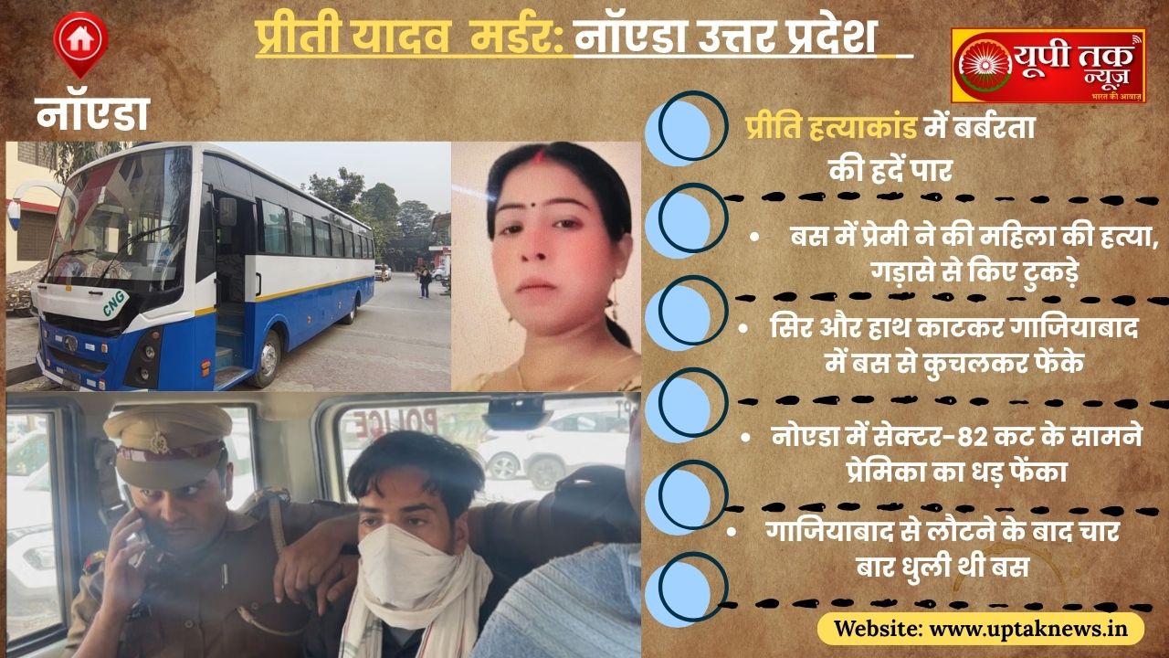 पुलिस के अनुसार, आरोपी मोनू ने सेक्टर-105 में बस रोकने के संबंध में जानकारी दी है कि उसने सेक्टर-100 के पास से एक पराठा और महिला के लिए मैगी बनवाई थी। यह खाने के लिए ही बस सेक्टर-105 में रोकी गई थी। वहां प्रीति ने मैगी का सेवन भी नहीं किया और साथ रहने का दबाव बनाने के लिए झगड़ा करने लगी। डीसीपी ने बताया कि मोनू अपनी पत्नी और बच्चों को छोड़कर प्रीति के पास रहने के लिए तैयार नहीं था। ऐसा न करने पर प्रीति उसकी बेटियों का चाल-चलन बिगाड़ने की धमकी देती थी। इससे आरोपी काफी परेशान हो रहा था। गड़ासा, जिससे सिर और हाथ काटे गए, उसे प्रीति के घर से कुछ दिन पहले चोरी से लाया गया था। यह गड़ासा मछली और मुर्गा काटने वाला था, जिसकी वजह से धार तेज थी।
